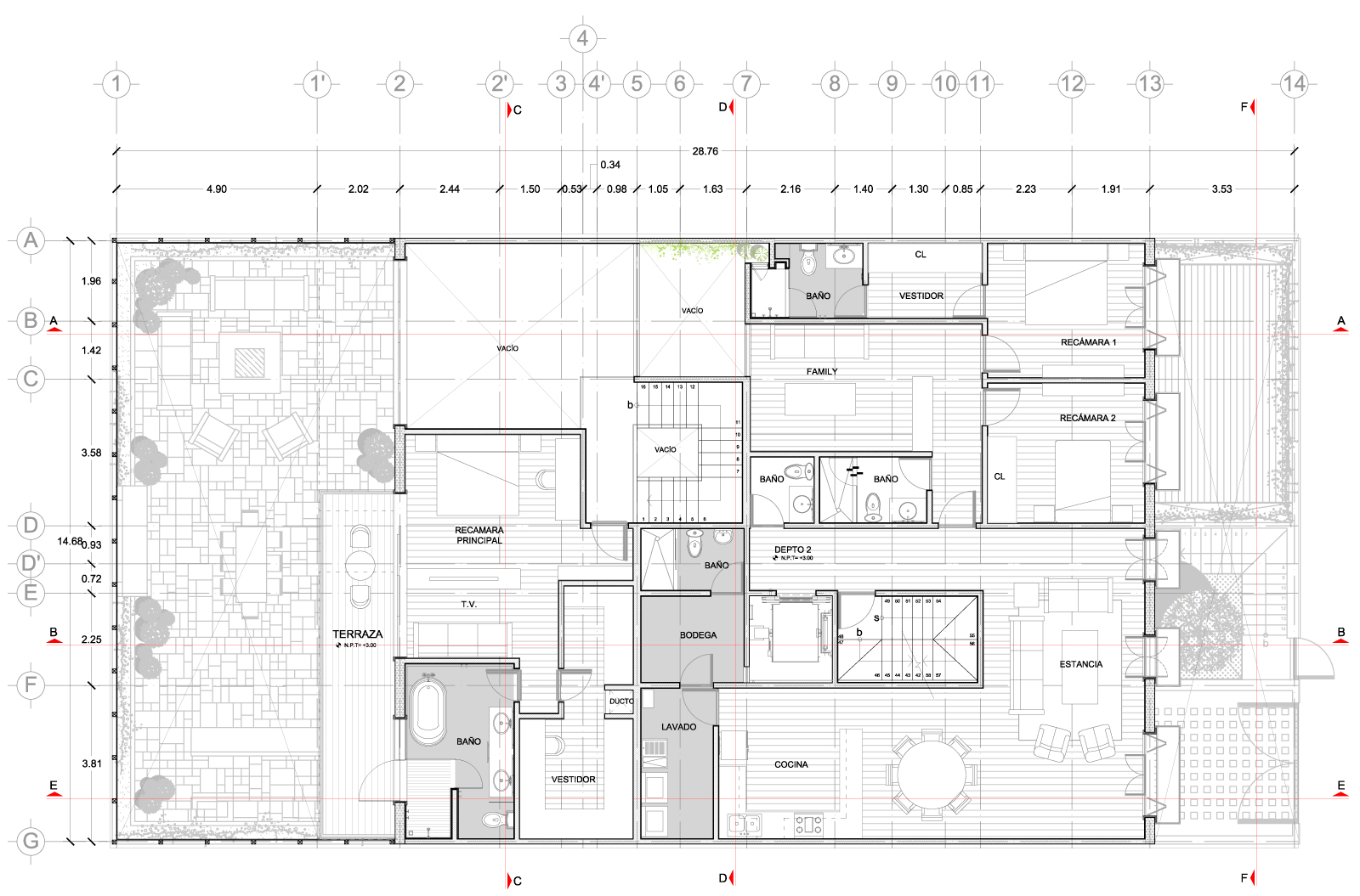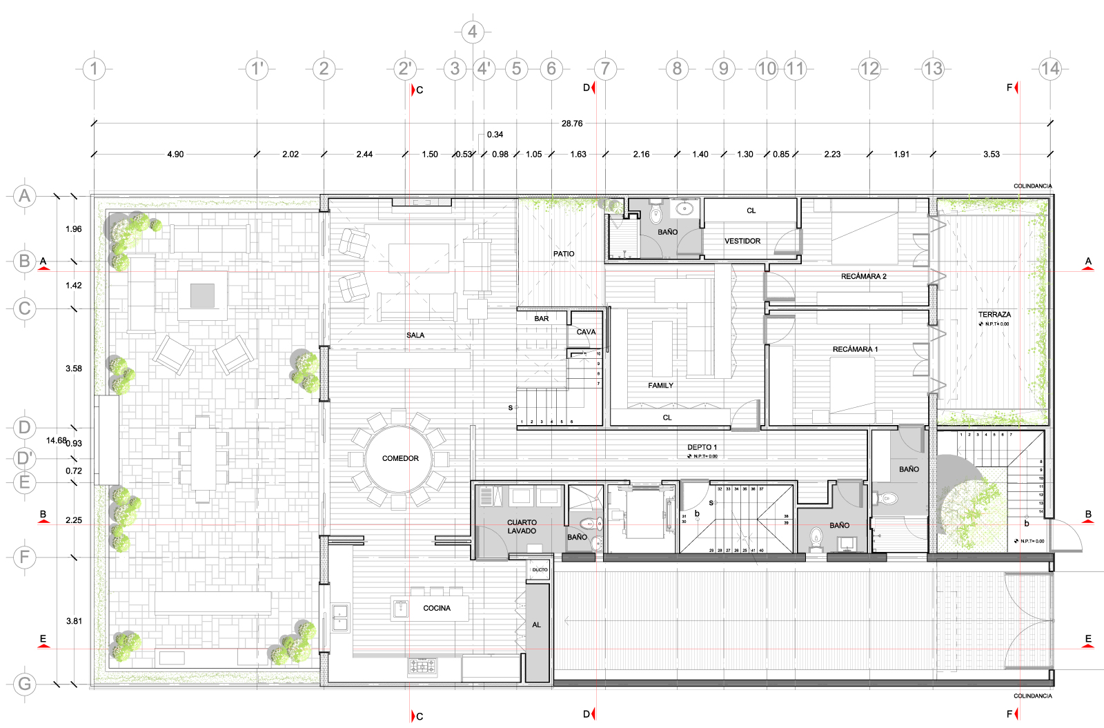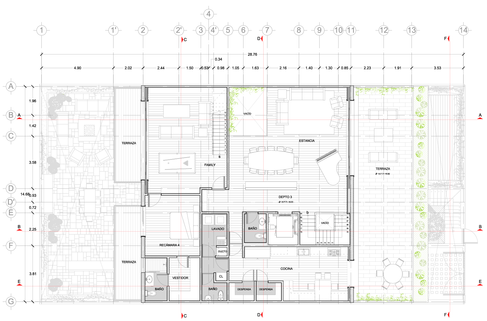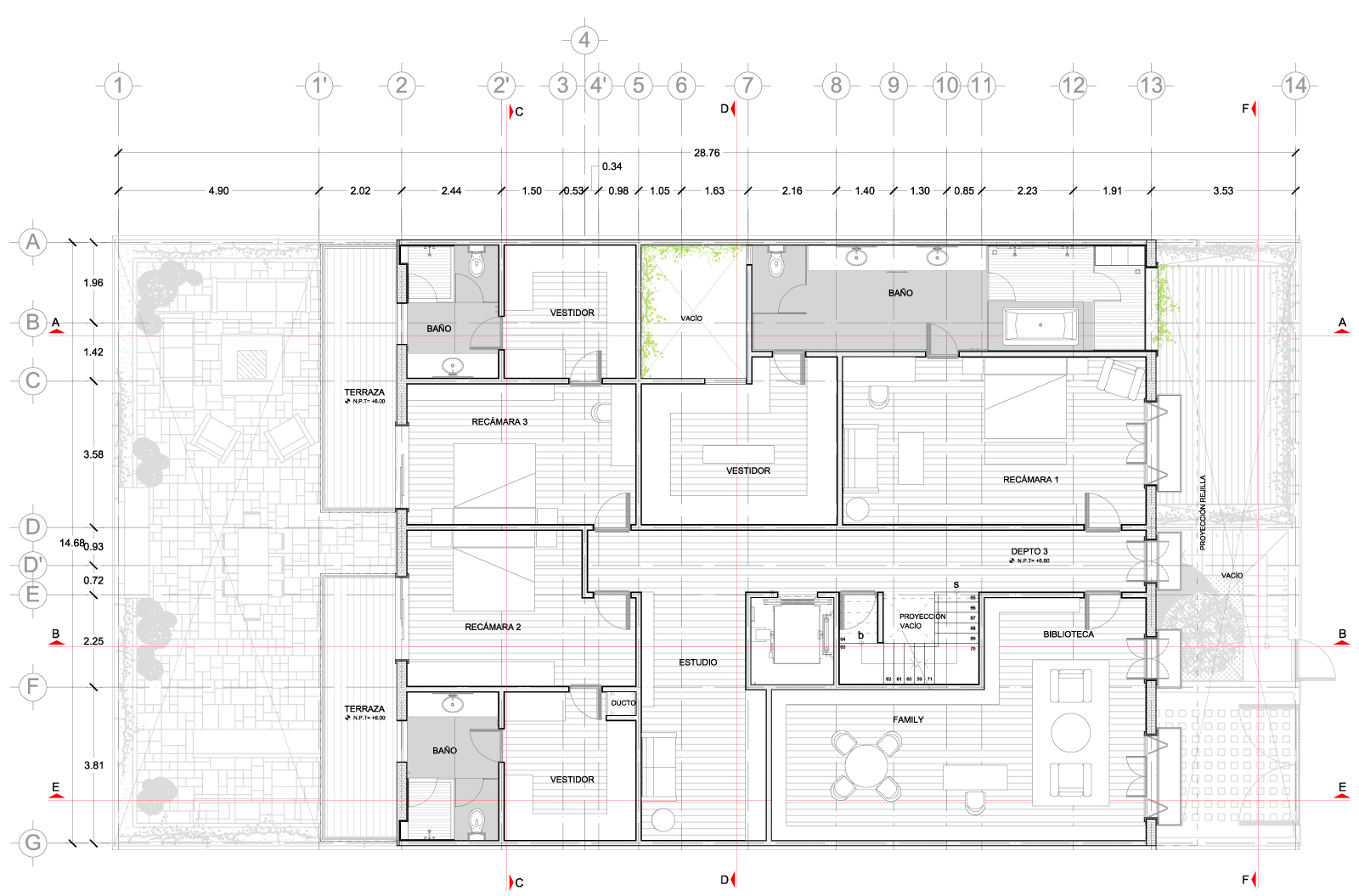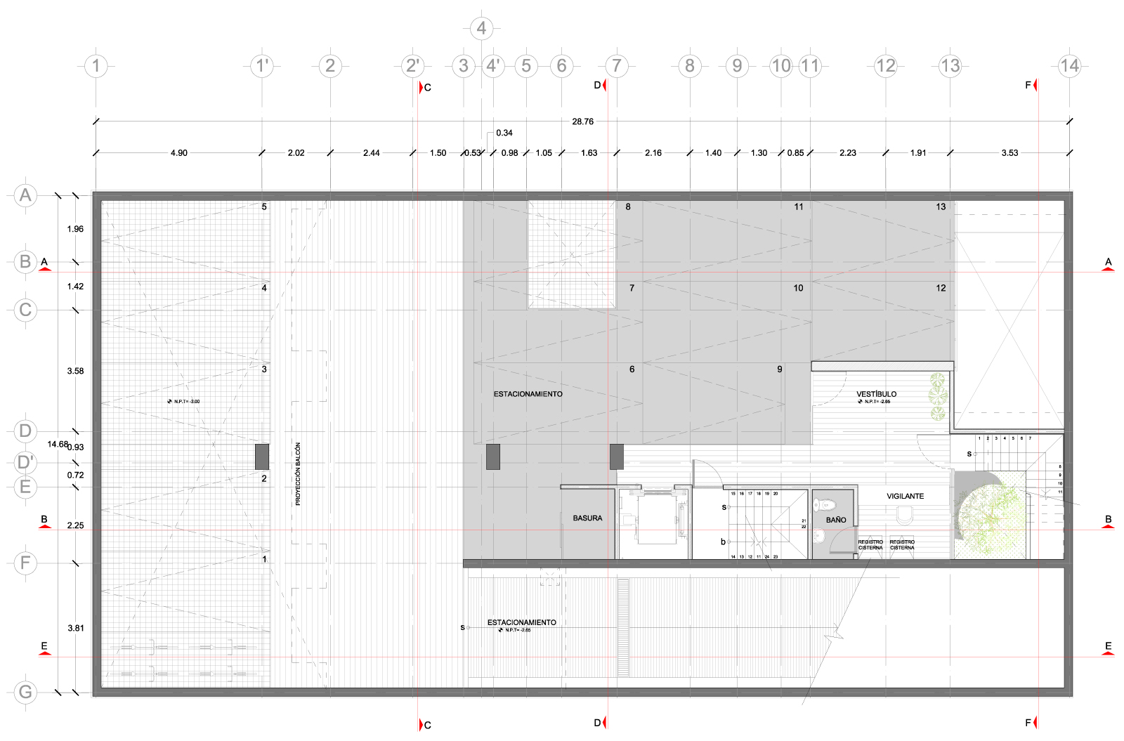 Se proyectó construir un edificio de 7 niveles, para alojar 3 departamentos diferentes dimensiones y diferentes usos múltiples. El edificio cuenta con una altura de 15 metros sobre el nivel de banqueta y dos sótanos. El acceso al edificio se da a través de la planta baja por medio de una rampa para vehículos y un acceso peatonal con escaleras para bajar al lobby en el primer sótano.